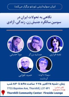 ایران سولیداریتی در تورنتو برگزار می کند: نگاهی به تحولات ایران در سومین سالگرد جنبش زن زندگی آزادی, زمان: شنبه 25 اکتبر 7 روز ago آخرین اطلاعیه ها به اشتراک گذاری Facebook Twitter به اشتراک گذاری Facebook Twitter