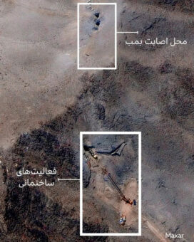 در این تصاویر بیلمکانیکی و جرثقیل در بالای یک جاده تازهساز برای دسترسی به محل دیده میشوند، نزدیک به نقطهای که هدف بمبهای سنگرشکن جیبییو۵۷ آمریکا قرار گرفته بود.