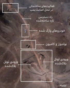 در بخش پایینتر دامنه کوه نیز یک بولدوزر و کامیون دیده میشود.در ورودی سایت و ساختمان آسیبدیدهای در بخش شرقی مجموعه که در حملات هوایی اسرائیل، یک روز پس از حملات آمریکا خسارت دید، ماشینآلات ساختمانی دیده میشوند که مشغول به کار هستند.