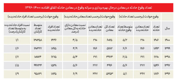 گزارش اخیر مرکز پژوهشهای مجلس که با تاکید بر حوادث در معادن ایران انجام شده، نشان میدهد از سال ۱۳۹۶ تا ۱۴۰۰، هشت هزار و ۴۹۱ حادثه در معادن ایران اتفاق افتاده؛ یعنی بهطور متوسط حدود پنج حادثه در هر معدن. سال ۱۴۰۰ بیشترین حوادث معادن مربوط به معادن سنگ آهن با ۳۹۰ مورد و زغال سنگ با ۳۶۸ مورد بوده است. هرچند در سال ۱۳۹۷ متوسط نرخ رشد سالیانه نسبت افراد حادثهدیده به کارکنان، کاهش منفی ۲۱ درصدی وجود داشته، اما در سال بعد رشد حدود ۱۳ درصدی افراد آسیبدیده رخ داده است.